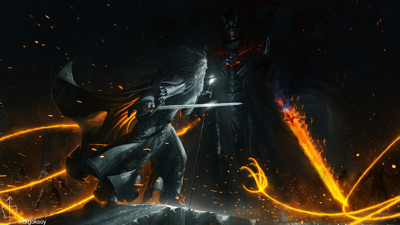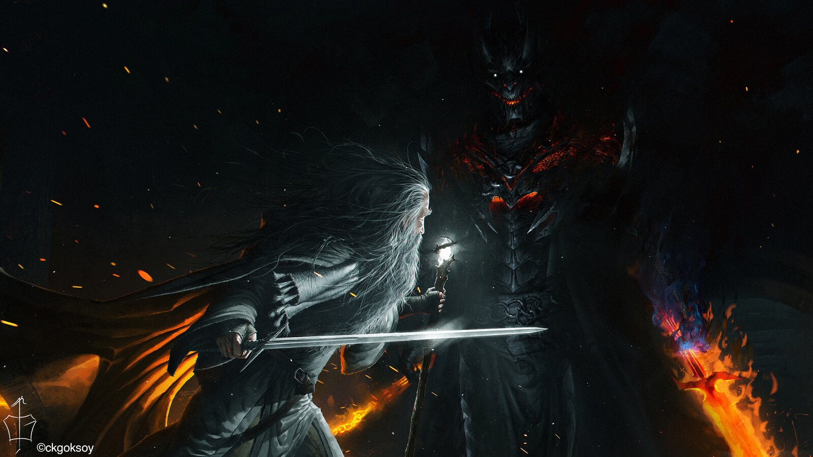 " ... The Balrog made no answer. The fire in it seemed to die, but the darkness grew. It stepped forward slowly on to the bridge, and suddenly it drew itself up to a great height, and its wings were spread from wall to wall; but still Gandalf could be seen, glimmering in the gloom; he seemed small, and altogether alone: grey and bent, like a wizened tree before the onset of a storm. From out of the shadow a red sword leaped flaming. Glamdring glittered white in answer."